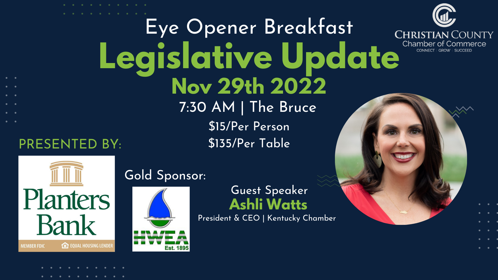 Join us for the 2022 Legislative Update Breakfast where we will hear from Kentucky Chamber President, Ashli Watts about the goals they are working towards for the upcoming General Assembly and how we are affected locally.